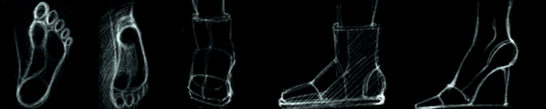 С учетом несложных упражнений, которые мы сделали перед этим, порисуйте уже более реалистичные ступни. Посмотрите, чем отличается тыльная сторона ступни от внешней. Можете порисовать ступни в обуви. Здесь нужно понимать, что обувь находится на объеме ступни, значит - повторяет ее форму. Если ступня поворачивается в пространстве или сгибается, значит и обувь принимает ее форму, повторяет ее движение.